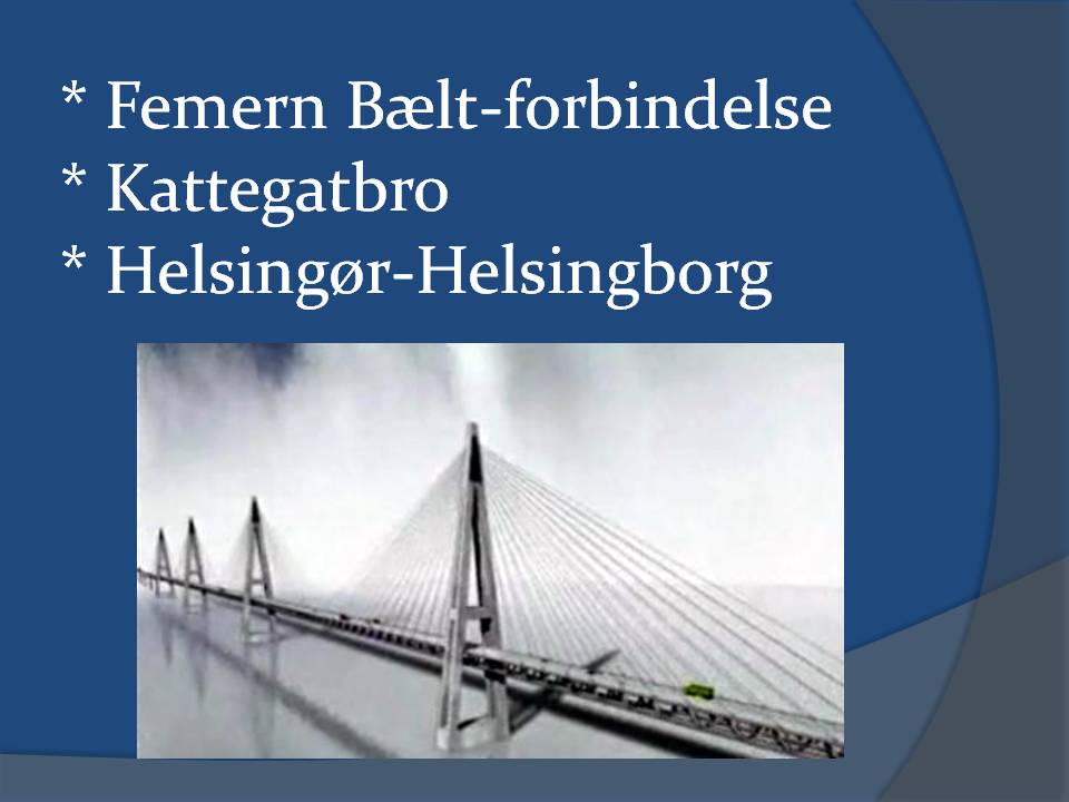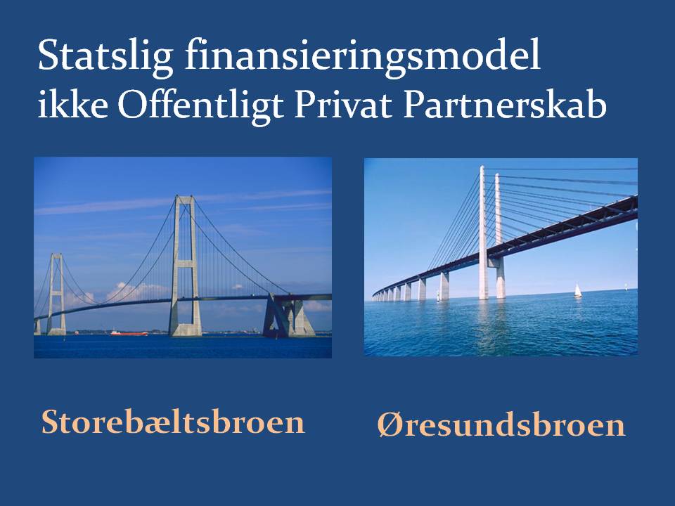 Sæt turbo på infrastrukturprojekterne Lad os omgående sætte turbo på alle de offentlige infrastrukturprojekter, der er færdigudarbejdede, men som blot er blevet udskudt på grund af manglende finansiering, og lad os fremrykke Femern Bælt-forbindelsen mest muligt. Lad os iværksætte en omgående undersøgelse af den bedste udarbejdning af en Kattegat-forbindelse med den første del af det kommende danske magnettognet. Samtidigt bør vi i samarbejde med Sverige undersøge, hvordan vi bedst udformer og bygger en fast forbindelse mellem Helsingør og Helsingborg. De faste forbindelser kan opføres med statslig kreditgaranti og finansieres gennem brugerbetaling, som det har været tilfældet med Storebælts- og Øresundsbroen. Det danske magnettognet må derimod ligesom jernbane- og vejnettet bygges for statslige penge, der kan sikre en maksimal udnyttelse i fremtiden. Staten betaler for bygningen og vedligeholdelsen af vejnettet, mens bilisterne nøjes med at betale deres egne driftsomkostninger. På samme vis skal brugen af magnettognettet være gratis for et kommende driftsselskab, så der sker en overflyttelse af person- og godstransport til magnettognettet, og vi dermed får en stor samfundsmæssig besparelse i form af de investeringer, vi ellers måtte foretage for at udvide kapaciteten på det danske motorvejsnet. I sine store projekter i 30’erne ansatte Roosevelt halvdelen af de daværende arbejdsløse, og gjorde det muligt for USA at genrejse sig fra krisen og efterfølgende vinde 2. Verdenskrig. Selv i Danmark satte vi projekter i gang som bygningen af Lillebælts- og Storstrømsbroen.