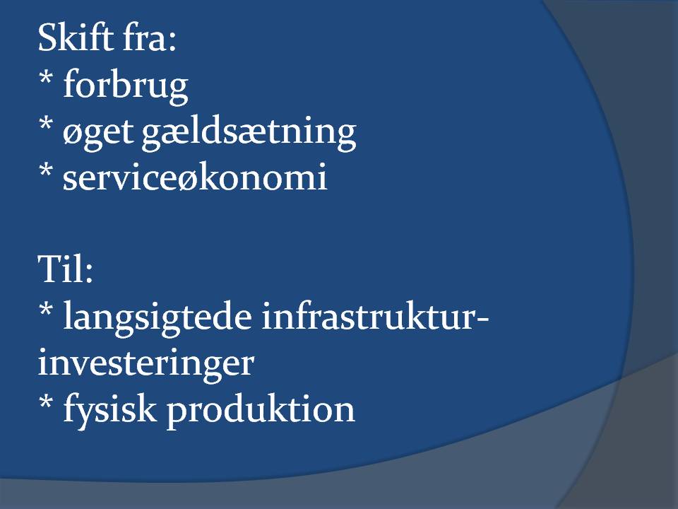 Infrastruktur er investering Penge, der bliver investeret i fysiske infrastrukturprojekter, er nemlig ikke penge ud af vinduet, som de nuværende hjælpepakker til insolvente banker og bankerotte spekulanter er det. En motorvej, en ny bro eller endnu mere spændende – et magnettognet, der dramatisk reducerer rejsetiden og gør det muligt for den kollektive trafik at udkonkurrere bil og lastvognstrafik – er en stor udskrivning her og nu, men bevirker en stigning i hele økonomiens fremtidige produktivitet, og tjenes derfor efterfølgende ind mange gange om. Som vi f.eks. så det med den oprindelige etablering af jernbaner og veje eller efter åbningen af Storebæltsbroen. Den danske økonomi behøver ikke stimulering gennem skattelettelser eller udbetaling af indefrosne pensioner, der blot vil fortsætte de seneste årtiers stigende privatforbrug baseret på en voksende gældsætning med en voksende servicesektor til følge, men behøver de positive økonomiske effekter, der følger af investeringer i samfundets grundlæggende økonomiske infrastruktur. Spørgsmålet er derfor ikke, hvor lidt vi kan slippe af sted med at bruge på infrastrukturen – som har været holdningen hos den nuværende regering de seneste otte år – men hvor mange penge vi på fornuftig vis kan investere i den. Det er fint at Femern Bælt-forbindelsen langt om længe sættes i gang i 2012, men vi skal sætte langt mere i gang langt hurtigere, hvis vi ønsker at undgå et totalt sammenbrud af den danske økonomi med skyhøj arbejdsløshed til følge.
