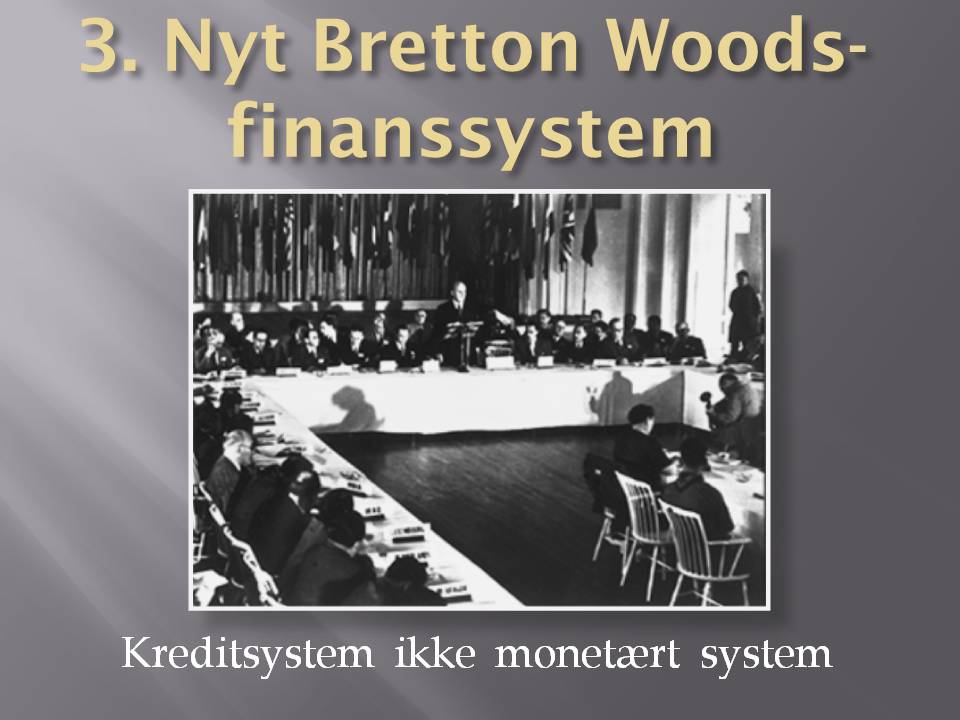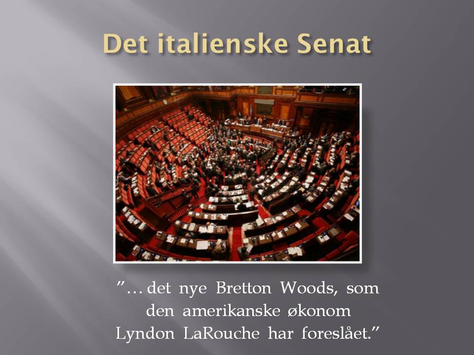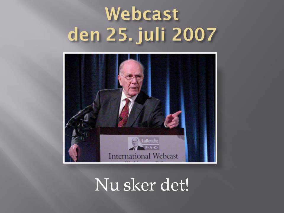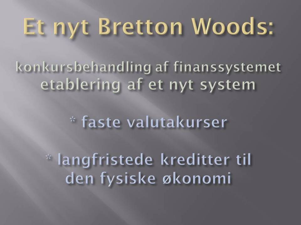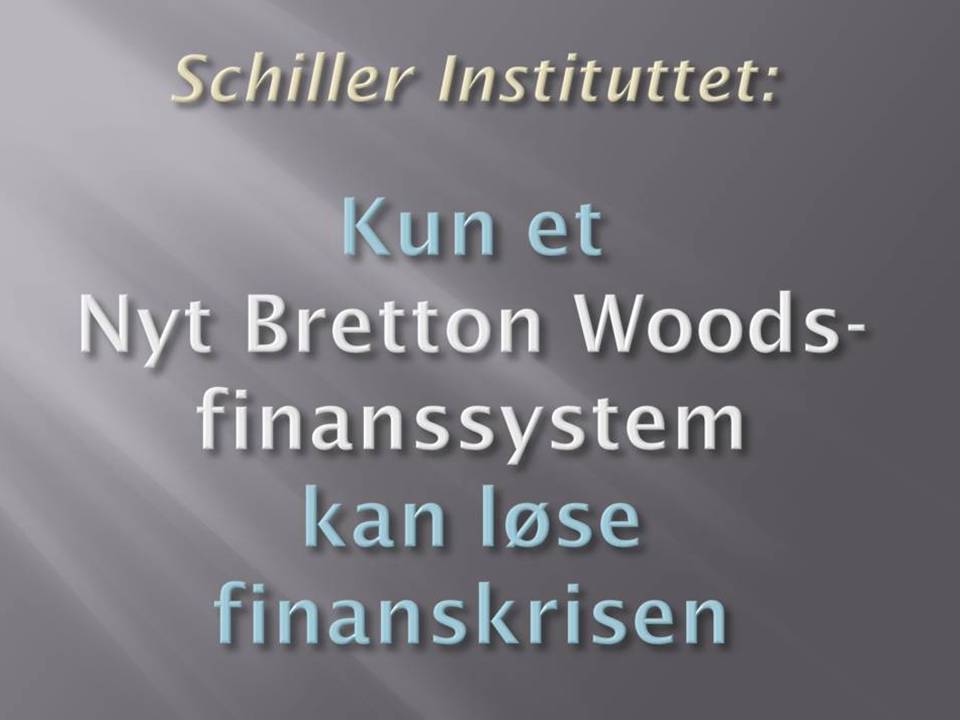 3. A New Bretton Woods The current financial system which has been destroyed by speculation has to be put through bankruptcy reorganization, and replaced by a modern version of the Bretton Woods system which Roosevelt initiated in 1944. The new system must be credit based, as Roosevelt had planned, rather than monetarist, so that there are built-in mechanisms to create credit for national and international projects. The growing revolt in the American population which resulted in the House of Representatives voting no to the Bush administration's bail-out package, gives hope that the U.S. can shift policy, and help launch a New Bretton Woods financial system, together with Russia, China and India, which have already signaled that they would join. It means that the current confrontation policy is replaced with a return to respect for national sovereignty and cooperation, in the spirit of the Peace of Westphalia from 1648. Other countries will, of course, also join. In Italy, Senator Oscar Peterlini, together with 19 other senators, have introduced a resolution in the Italian Senate, that the government should work for the introduction of a "new system formed like the New Bretton Woods, that the American economist Lyndon LaRouche has proposed", a thought which Italian Finance- and Economy Minister Tremonti has already promoted in a big way. French President Sarkozy has also just announced that he will convene a crisis meeting to prepare an international conference about a new financial system. Denmark ought to join and actively work for such a new financial system, which would establish fixed currently rates and raw material prices between nations, and create long-term credit for investment in production and infrastructure. As the same time, we must cooperate on big projects and development programs (like the Eurasian Land-Bridge), which will take up to two generations to complete, and which can increase the scientific and productive level. The ideology of globalization and ultra-liberal free market policy, without public oversight and control, has failed. Either we follow LaRouche's instructions and return to a policy which puts the general welfare of the population first, and can ensure economic growth in the real economy, or we will face a new dark age, with economic collapse, chaos and war. Therefore, Parliament should hold an emergency hearing about the financial crisis and the establishment of a New Bretton Woods financial system, and invite Lyndon LaRouche, who has been able to predict the crisis, and knows what to do, as an expert. Thank you.