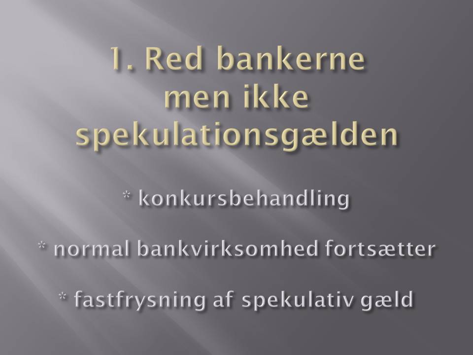 1. Save the banks and homeowners -- not the speculators As different banks and financial institutions fail, the authorities should not let the taxpayers take over the bank's debt (as was the case with Roskilde Bank). Instead, bankruptcy reorganization should ensure that the banks' normal banking operations continue unimpeded in a reconstructed bank, and the bad loans, derivatives, etc. (speculative financial instruments like options, futures, credit default swaps, mortgage-backed securities, etc.) should be frozen and taken care of later. Speculators can be allowed to loose their shirts, but it is important that small depositors and businesses are protected, and that the banks can continue their daily activities, which an economy can not be without. The state must at the same time prevent a flood of evictions.
