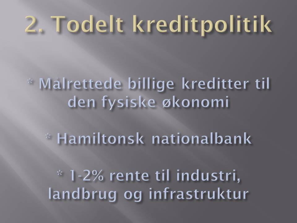 2. A two-tiered credit policy Instead of uncritically pumping billions into the financial markets through national and central banks, we must direct national credit to those parts of the physical economy, which can suffer during the credit crisis, which is quickly becoming worse. We have to prepare ourselves for recognizing that the times in which the Danish deposit deficit could be gotten on the international financial markets, are forever over. Therefore, the state ought to use the national bank as a real Hamiltonian national bank, with a two-tiered credit policy. We can let the interest for loans to the financial markets be pretty high, and, simultaneously, have cheap credit at 1-2%, for investments in industry, farming and infrastructure, which the state issues, through the national bank, to private firms through their normal banks. In a similar way, we can finance connections across the Fehmarn Belt [across the Baltic Sea between Denmark and Germany], the Kattegat Sea [between Zealand, the island upon which Copenhagen is located, and the Danish mainland Jutland peninsula], and the Sound (Elsinore [Denmark]-Helsingborg [Sweden]), as well as public investment in highways, trains and maglev, hospitals, educational institutions and research. That can get the economy going when the loan-based consumption party ebbs out. If the crisis causes average families to not be able to get reasonable mortgages, etc., the state must also help out.