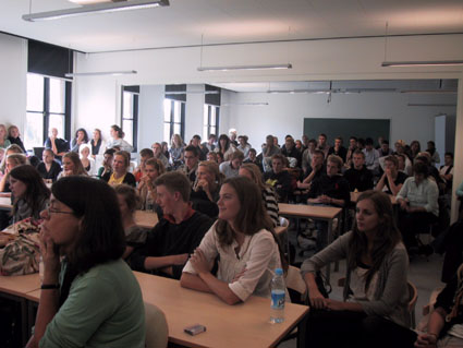 The presentation to students at Øregaard Gymnasium the day before (picture above) can be heard here. |