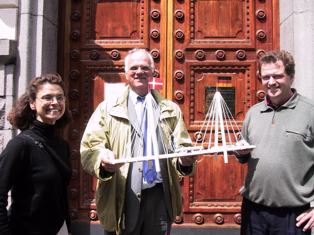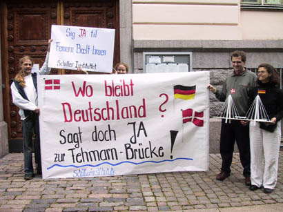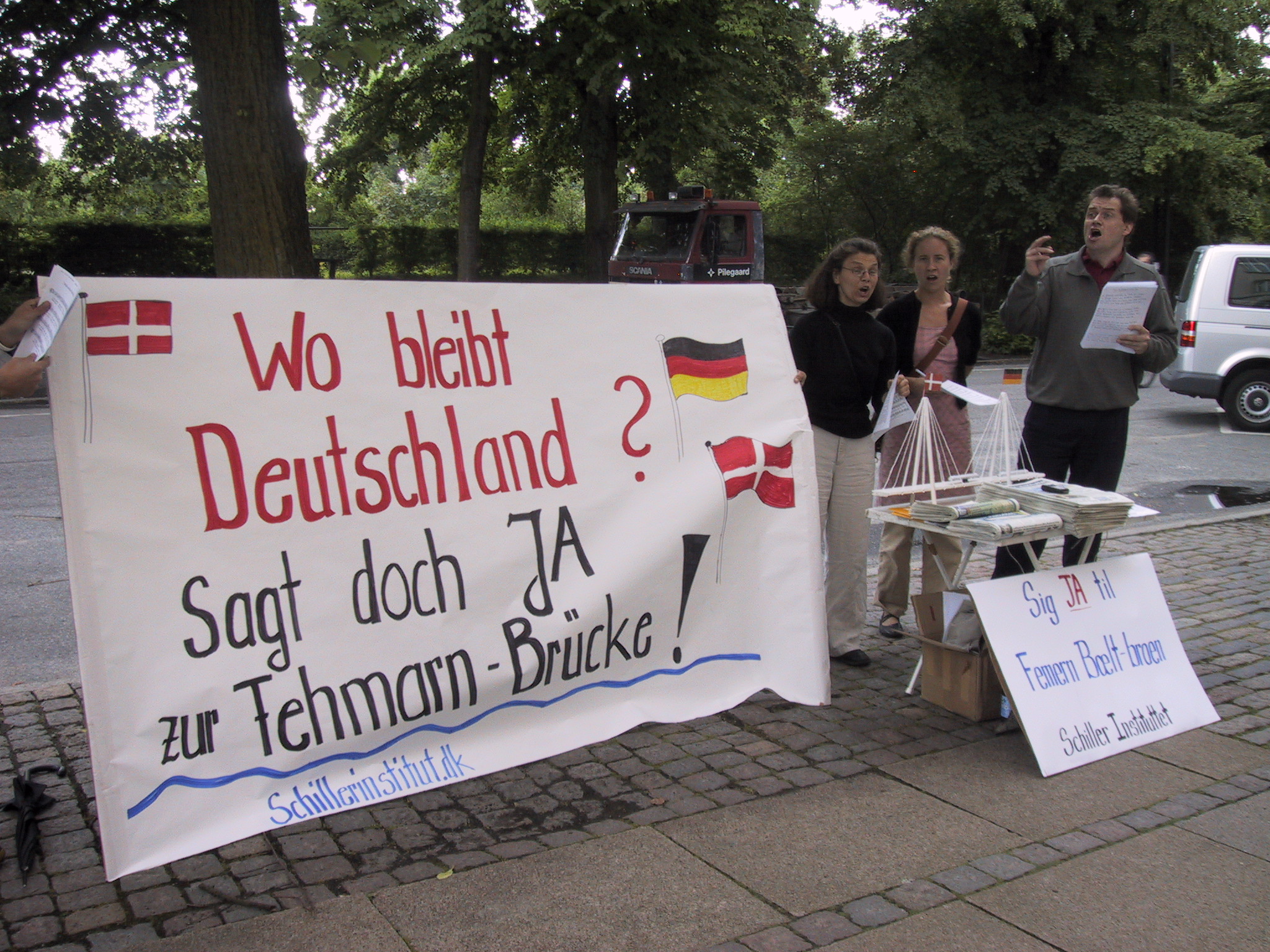 Sig Ja til Femern Bælt-broen! Den 18. juni 2007 afholdte Schiller Instituttet en demonstration til støtte for en Femern Bælt-bro foran den tyske ambassade i Stockholmsgade, København. Demonstrationen krydredes af festlig sang (som kan høres ved at klikke på titlerne), bl.a. en kanon af Haydn med en let omskrevet tekst: "Es sagen Ja die Dänen, die Deutschen sagen nein, Ja, Nein, Lass uns die Brücke bauen, denkt nicht so klein, Ein grosses Land denkt nicht so klein" (Danskerne siger ja, tyskerne siger nej, ja, nej, lad os bygge broen, tænk ikke så småt, et stort land tænker ikke småt), Freude Schöne Götterfunken, Die Gedanken Sind Frei, Freundschaft og andre sange. Som afslutning på demonstrationen talte Schiller Instituttets repræsentanter med den tyske ambassadør til Danmark, Dr. Gerhard Nourney (nederste billede i gul jakke), der modtag en lille Femern Bælt-bro vi havde med til lejligheden, materiale og en udtalelse af Schiller Instituttets danske formand Tom Gillesberg (til højre på billedet). Feride Istogu Gillesberg står på ambassadørens anden side. Udtalelse af Tom Gillesberg, formand for Schiller Instituttet i Danmark, den 18. juni 2007. Sig Ja til Femern Bælt-broen! I de glade dage i 1989 hvor Berlin-muren faldt og Tyskland langt om længe blev genforenet, lancerede Lyndon LaRouche og Schiller Instituttet et program, der kunne sikre at hele Europa kunne genforenes og få varig fred gennem økonomisk udvikling. Nøglen var, sagde vi, fysiske infrastrukturprojekter, der kunne udvikle Europas produktive potentiale. I marts 1990 sendte vi et dansk forslag på gaden med titlen. Paris-Berlin-Wien-trekanten: Et verdensøkonomisk lokomotiv, hvor vi redegjorde for nødvendigheden af at bygge ikke blot en Storebæltsbro men også broer over Øresund og Femern Bælt, der kunne forbinde Skandinavien med det nye Europa. Nu er tiden kommet til langt om længe få den sidste af de tre, Femern Bælt-broen, bygget! Broen er vigtig for Tyskland, Danmark og Skandinavien. Godstog fra Skandinavien til Europa må i dag rejse via Storebæltsbroen og man kan spare mange kilometer ved at benytte en Femern Bælt-bro. Miljømæssigt er det også galskab at rejse med færge i stedet for at køre over en bro. Og man skal huske på, at Femern Bælt-broen vil være Skandinaviens forbindelsesvej til resten af Europa og Eurasien, og Tysklands til Norden. I årene efter 1989 fremlagde Schiller Instituttet så sit forslag om Den eurasiske Landbro. Forslaget gik ud på at bygge infrastrukturkorridorer over Det eurasiske Kontinent, så Europa kunne forbindes med broderparten af verdensbefolkningen i Asien. Mange af vej- og jernbaneprojekterne er siden blevet bygget, og der er nu mulighed for at komme videre med processen. Rusland har besluttet at arbejde for bygningen af en tunnel under Beringstrædet med tilhørende jernbaneforbindelser, der vil gøre det muligt i fremtiden at rejse med tog fra Skandinavien, over Femern Bælt-broen og Det eurasiske Kontinent, til Nord- og Sydamerika! Derfor er det ikke i orden, at Tyskland vælger at være bagstræberisk og stå i vejen for Femern Bælt-broen. EU har da også erkendt betydningen af broen, og tilbudt at betale op til 30 procent af byggeprisen, men for at EU’s tilskud skal stå ved magt, skal der træffes en beslutning nu, så en ansøgning kan være i Bruxelles senest den 20. juli. Hvorfor er man så ikke gået i gang med at bygge broen endnu? Danmark har længe presset på, men Tyskland har vægret sig ved at skrive under på en aftale. Nogle siger, det er af økonomiske årsager, men selv om prisen for at bygge broen er ca. 30 milliarder kr., vil det ikke koste skatteyderne en krone. Med eller uden EU-tilskud er en sådan bro, hvis tingene gøres rigtigt, en forrygende forretning, som Danmark allerede har oplevet det med bygningen af Storebælts- og Øresundsbroen. Modellen er simpel: Der etableres et statsligt ejet selskab (helst i fællesskab mellem Tyskland og Danmark men ellers af et af landene alene), der med en statsgaranti i ryggen låner pengene til bygningen af broen. Når broen så åbner i 2015, vil de penge bilister og togselskaber før betalte for færgetransport gå til broafgift. På trods af den høje pris for bygningen af broen, og de renter og renters rente der løber på (som dog er betydeligt lavere end ellers, fordi man har en statsgaranti i ryggen) kan broafgifterne betale gælden tilbage over 20-25 år. Er trafikken mindre end forventet, tager det lidt længere tid at betale gælden tilbage, men som oftest går det lige modsat: Efterhånden som folk finder ud af, at man til samme pris kommer lettere og hurtigere over Femern Bælt end før, stiger trafikken kraftigt. Man kan så vælge mellem at sænke brotaksterne eller betale gælden tilbage hurtigere. Efter et par årtier står man så med en betalt bro, der ikke har kostet skattebetalerne en eneste krone. Der forsvinder selvfølgelig nogle arbejdspladser på færgerne og i havnene, men som man så det med bygningen af Storebæltsbroen, er det ikke noget problem. Selve bygningen af broen gav selvfølgelig øget beskæftigelse, men det gjorde den øgede økonomiske aktivitet efter broens åbning også. De gamle danske færgebyer Nyborg og Korsør har i dag langt højere beskæftigelse end før Storebæltsbroen åbnede. Som alle andre lande har Tyskland en forpligtelse overfor sine naboer. I de lykkelige tider hvor Tyskland var i fuld fart med videnskabeligt og teknologisk fremskridt, og en modsvarende økonomisk og infrastrukturmæssig opbygning, smittede det af på hele Europa og andre dele af verden. Når Tyskland, som det er tilfældet i de senere år, er gået i baglås og er holdt op med at udvikle sig, så bliver fremtiden for resten af os blokeret. Det gælder ikke blot med hensyn til Femern Bælt-broen men også med anden infrastruktur, som f.eks. etableringen af et magnetsvævetognet (f.eks. med det tyske Transrapid), der ville kunne erstatte meget af den 