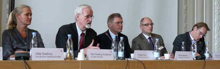 Årsagerne til den globale fødevarekrise og konsekvenserne for de fattigste lande: Prof. Henrik Hansen, Københavns Universitet, Fødevareøkonomisk Institut Professor Henrik Hansens oplæg.pdf (PDF) (diagrammer til foredraget) Desværre var Henrik Hansens foredrag et forsøg på at "bevise", at der ikke er en fødevarekrise, men blot en "mediehype" (på trods af, at hans egne diagrammer viser, at fødevareforsyningen pr. person er holdt op med at vokse i de seneste tyve år). Han konkluderede derfor, at politikerne ikke skal gribe ind, men overlade det hele til markedskræfterne. Konsekvenserne for de 800 millioner sultne og underernærede bekymrede ikke økonomen, da han, som han sagde, ikke er professor i etik.