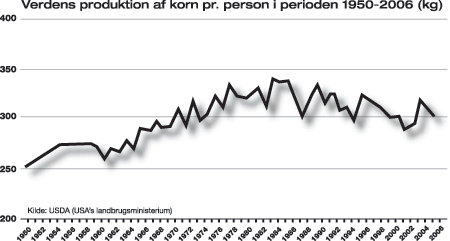 De populære bortforklaringer på fødevarekrisen, som når medierne siger, at den skyldes en fejlslagen høst i Australien, og at inderne og kineserne er begyndt at spise mere, eller når Verdensnaturfondens grundlægger prins Philip hævder, at krisen skyldes overbefolkning, er kynisk manipulation. Ser man på den globale kornproduktion per person over de seneste 50 år [se diagram nederst på siden], frem til slutningen af 1980’erne, er det tydeligt, at samtidigt som befolkningstallet steg, øgedes produktionen langt mere, fordi den ikke blev overladt til det »frie« marked, men blev prioriteret med programmer for national fødevareselvforsyning, øremærkede kreditter til landbrugsinvesteringer og produktionspriser for landmændene.[ii]