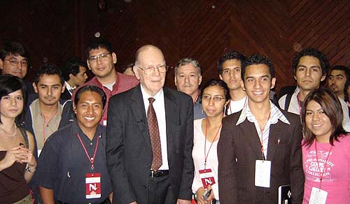 Lyndon LaRouche sammen med medlemmer af LaRouches Ungdomsbevægelse LYM i Monterrey, Mexico.