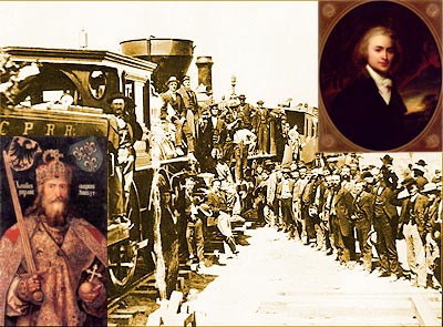 Til venstre: Karl den Store (742-814) byggede et netværk af kanaler til transport, som udviklede hele den europæiske økonomi. Til højre: Som udenrigsminister tænkte John Quincy Adams (1767-1848) på lignende vis på, hvordan man med jernbaner kunne sammenknytte hele US - som en kontinental nation fra Canada til Mexico og fra Atlanten til Stillehavet. Midten: Åbningen af Den transkontinentale Jernbane i 1869.