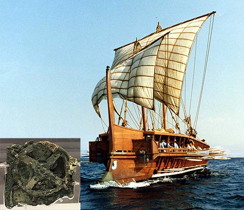 Det er i forbindelse med navigation efter stjernerne på lange sørejser, at videnskab for alvor kom i gang. Til venstre ses Antikythera-mekanismen fra omkring 150-100 f.Kr., som er en mekanisk regnemaskine til at beregne astronomiske positioner. Den blev fundet i et skibsvrag i nærheden af den græske ø Antikythera, og har over 30 tandhjul og drejeskiver for at kunne beregne planeternes positioner. Lignende avancerede apparater blev først genopfundet over tusind år senere.