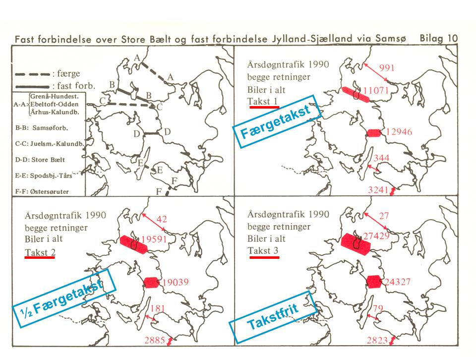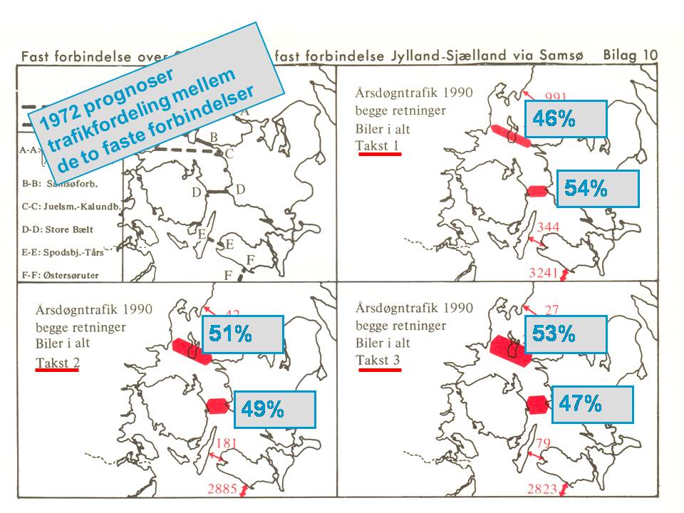 Trafikøkonom Uffe Jacobsen fortalte i sit indlæg, at der fra et trafikmæssigt standpunkt er så megen logik i en direkte forbindelse mellem Århus og København over Kattegat, at en sådan allerede var med i trafikforskningen i 1972. Den kunne have stået færdig i 1990, og man regnede dengang med, at trafikken af sig selv ville fordele sig fifty-fifty mellem broerne over Storebælt og Kattegat (klik på billederne for at se dem i stor format). |