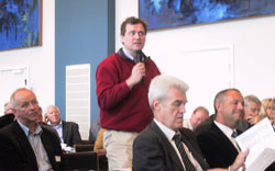 Michelle Rasmussen: "Jeg er Michelle Rasmussen fra Schiller Instituttets publikationer. Jeg vil gerne spørge Poul Arne Jensen, men også sige noget generelt. For du tog spørgsmål op om magnettog, som vi har kørt som en offentlig kampagne i det sidste års tid, og jeg vil bare sige, at i diskussioner med nogle politikere så har der været nogle, som har sagt "Ja, men det er en spændende ide, men vi er bange for at det lettere vil blive skudt ned, hvis det er, hvad nogle vil betragter som ’way out’, som en magnettogforbindelse vil være. Men jeg vil gerne sige, at med vores offentlige kampagne har vi erfaret, at man ikke skal undervurdere den begejstring der er i den danske befolkning for sådan nogle fremtidige projekter, specielt efter Storebæltsbroen har været en realitet – har været den største succes i dansk historie. Folk ude på gaden, de bliver så begejstret for ideen om Århus til København på 25 minutter, København til Aalborg på 43 minutter, og i den samme ånd, hvor JF Kennedy organiserede den amerikanske befolkning bag et Apollo-projekt, fordi det var en stor udfordring og det ville have en kæmpe effekt i hele samfundet. Hvad kan vi sige til politikere, som er lidt bange for reaktionen i befolkninge, for virkelig at tage et hop ind i fremtiden?" Poul Arne Jensens svar: "Om [at jeg tog op] magnettog. Grunden til det, var særligt det tidsmæssige perspektiv. Der er ingen tvivl om, at hvis det tidsmæssige perspektiv bestemmer alene, så er det af stor interesse både for private personer og for erhvervslivet, at det er hurtig transport mellem København og andre steder i Danmark. De miljømæssige forhold og anlægsinvestereinger kender jeg ikke ret meget til. Men det er klart - jeg sagde eksemplevis, at der ligger en i Shanghai, som jeg selv har kørt med. Den tror jeg ikke var anlagt for sjovs skyld. Den har et helt specielt formål. Den ligger også i en by, hvor der bor 7 mio. mennesker, det må jeg sige, det er forskelligt, fra hvad vi arbejder med her. Men det tidsmæssige perspektiv er der ingen tvivl om på sigt vil have en helt afgørende betydning. Vi arbejder allesammen i vores hverdag med kortere og kortere tidsfrister for al ting. Det gælder også transport." |